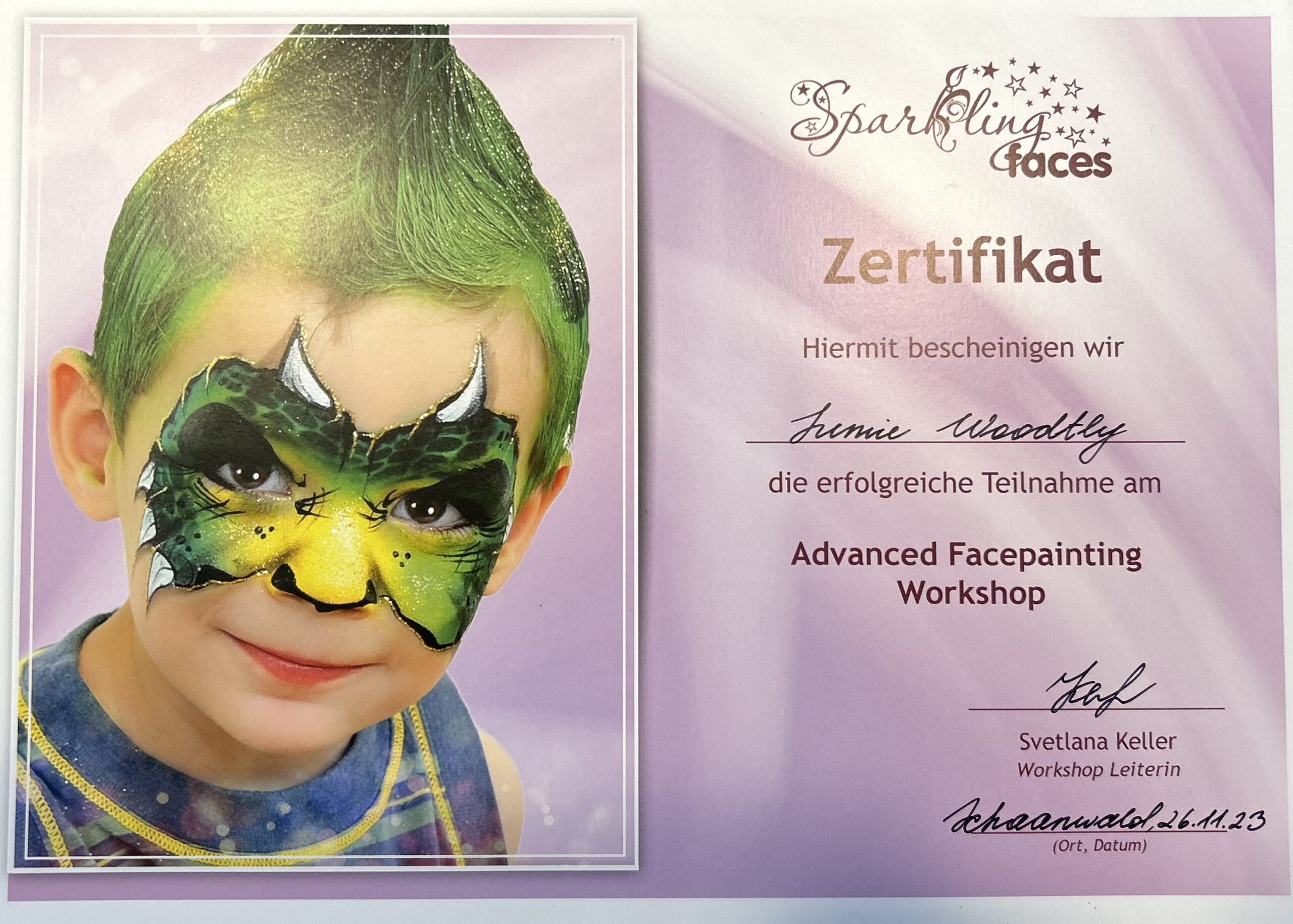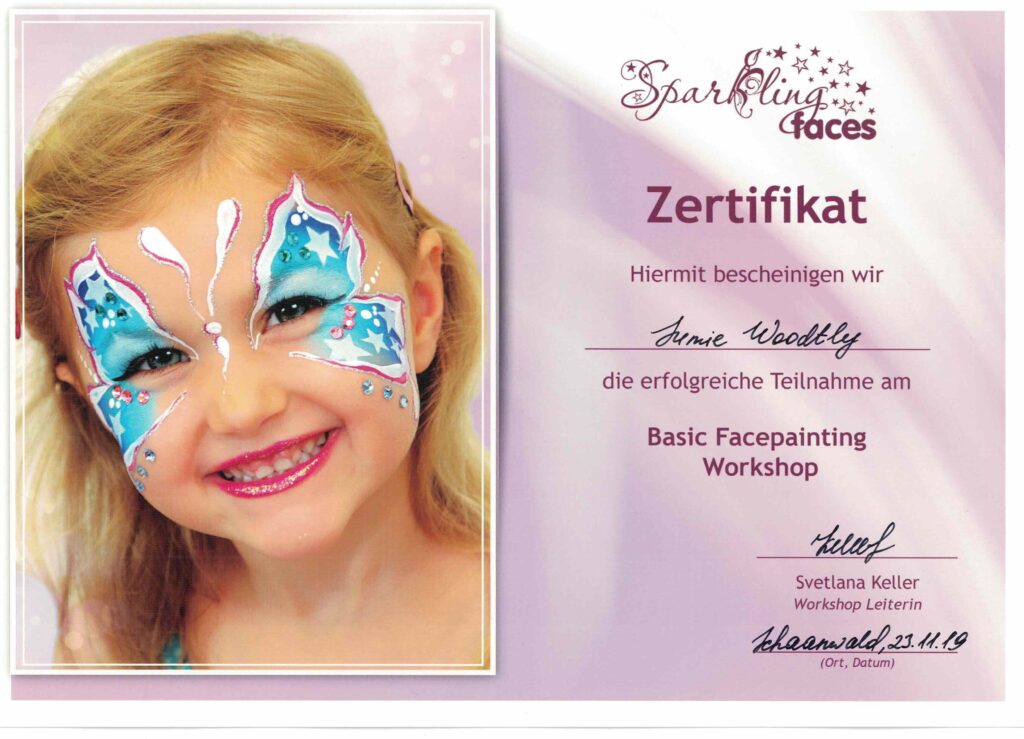 Seit vier Jahren gehört auch das Kinderschminken zu meinem Angebot. Ich habe mich dafür professionell ausbilden lassen und mehrere Weiterbildungen besucht – mit viel Freude und Kreativität bringe ich Kinderaugen zum Leuchten.